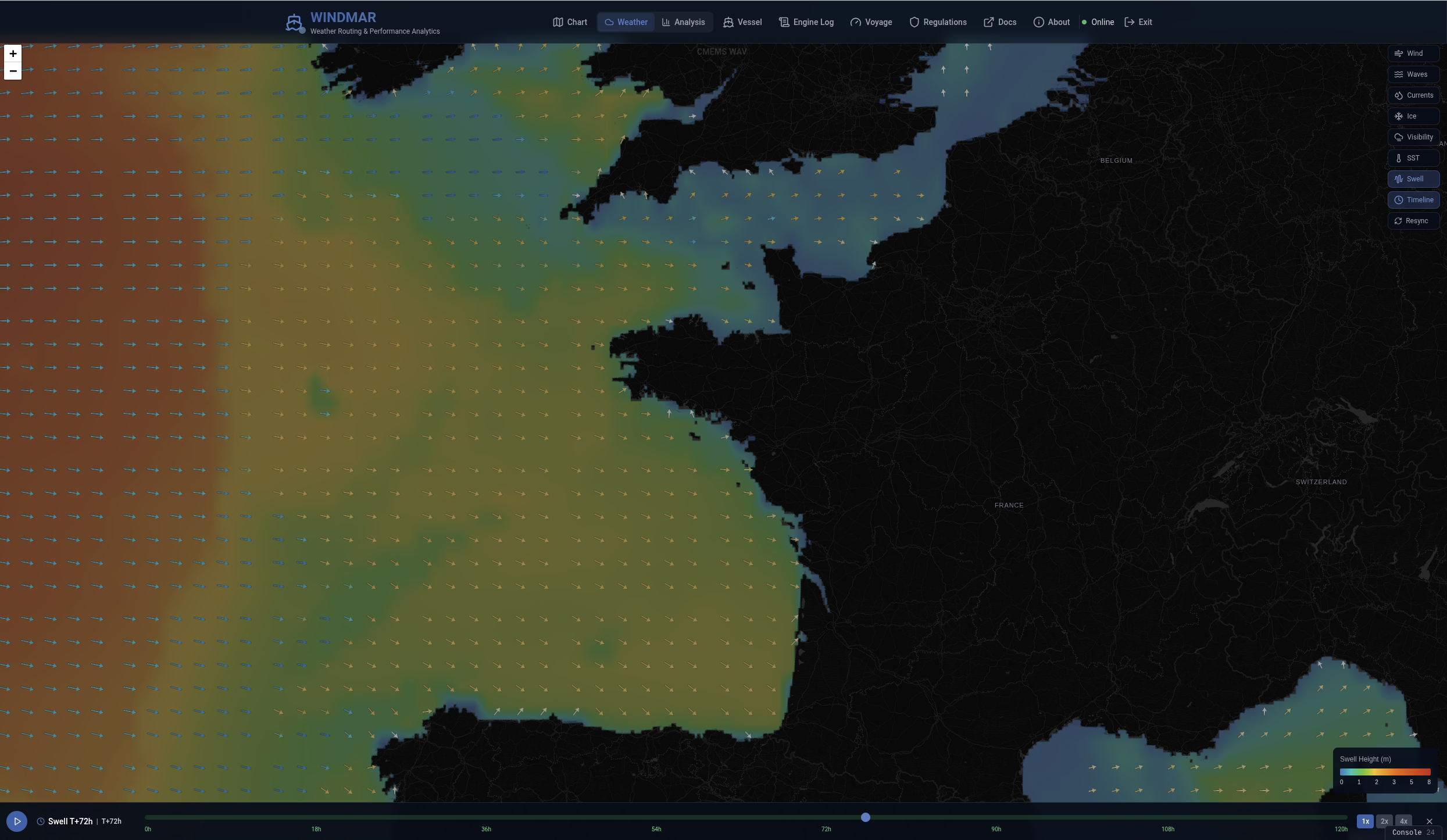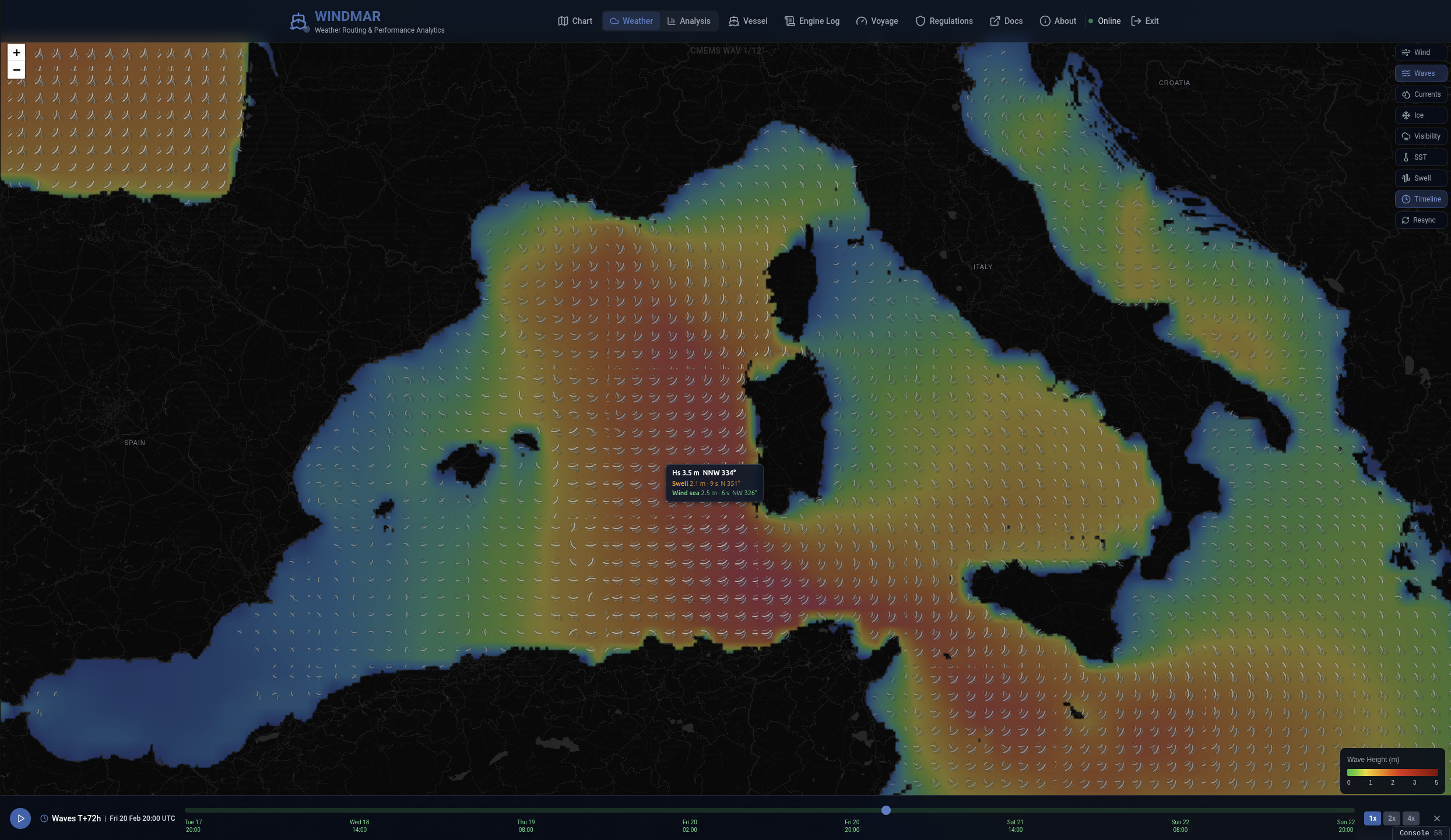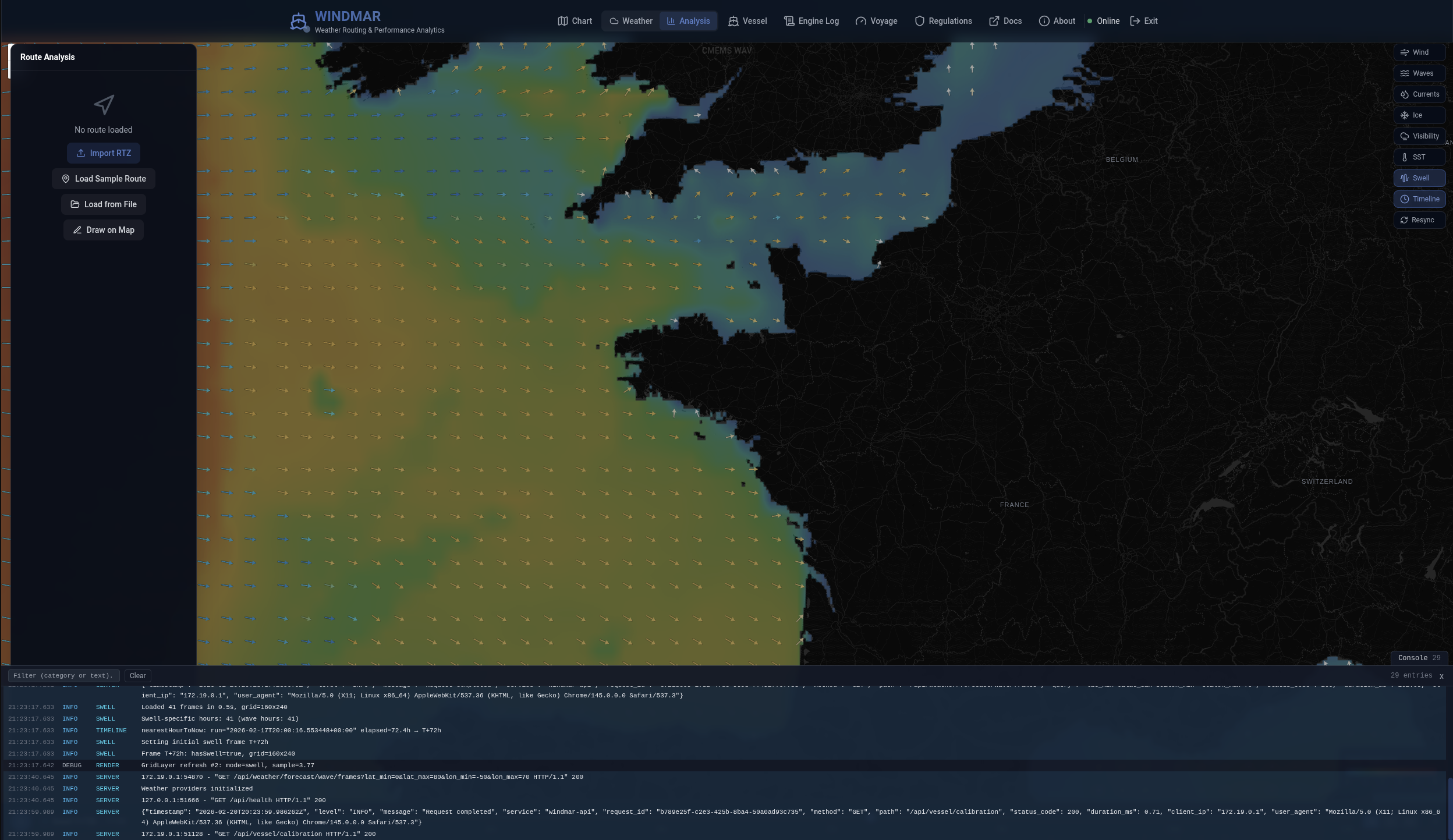 The system ingests near-real-time wind data from NOAA GFS (0.25° resolution, via NOMADS), wave, current, SST, swell, visibility, and ice data from Copernicus Marine Service (CMEMS), with ERA5 reanalysis as a secondary wind fallback. Weather grids are pre-ingested into PostgreSQL on a 6-hourly cycle (wind, waves, currents, ice), with on-demand prefetch for SST, visibility, and swell — enabling sub-second route calculations. A forecast timeline (f000–f120, 3-hourly steps) supports all 7 weather layers with play/pause and scrubbing. The interface uses a two-mode architecture: Weather mode presents a full-screen ECDIS-style chart with 7 weather overlays and WMO-standard color ramps; Analysis mode displays a left panel (320px) for route import, voyage calculation, optimization comparison (A* engine with optional VISIR Dijkstra), and Monte Carlo simulation (P10/P50/P90). A dedicated analysis page shows a per-waypoint passage plan with ETA, SOG, wind, waves, current speed/direction, fuel, and data source badges. The system evaluates vessel motions (roll, pitch, vertical acceleration) and enforces safety criteria that block or penalize dangerous sea states. It calculates the IMO Carbon Intensity Indicator (CII) rating for the completed voyage, enabling operators to assess regulatory compliance before departure.