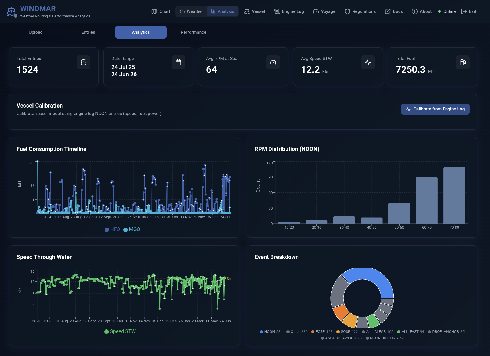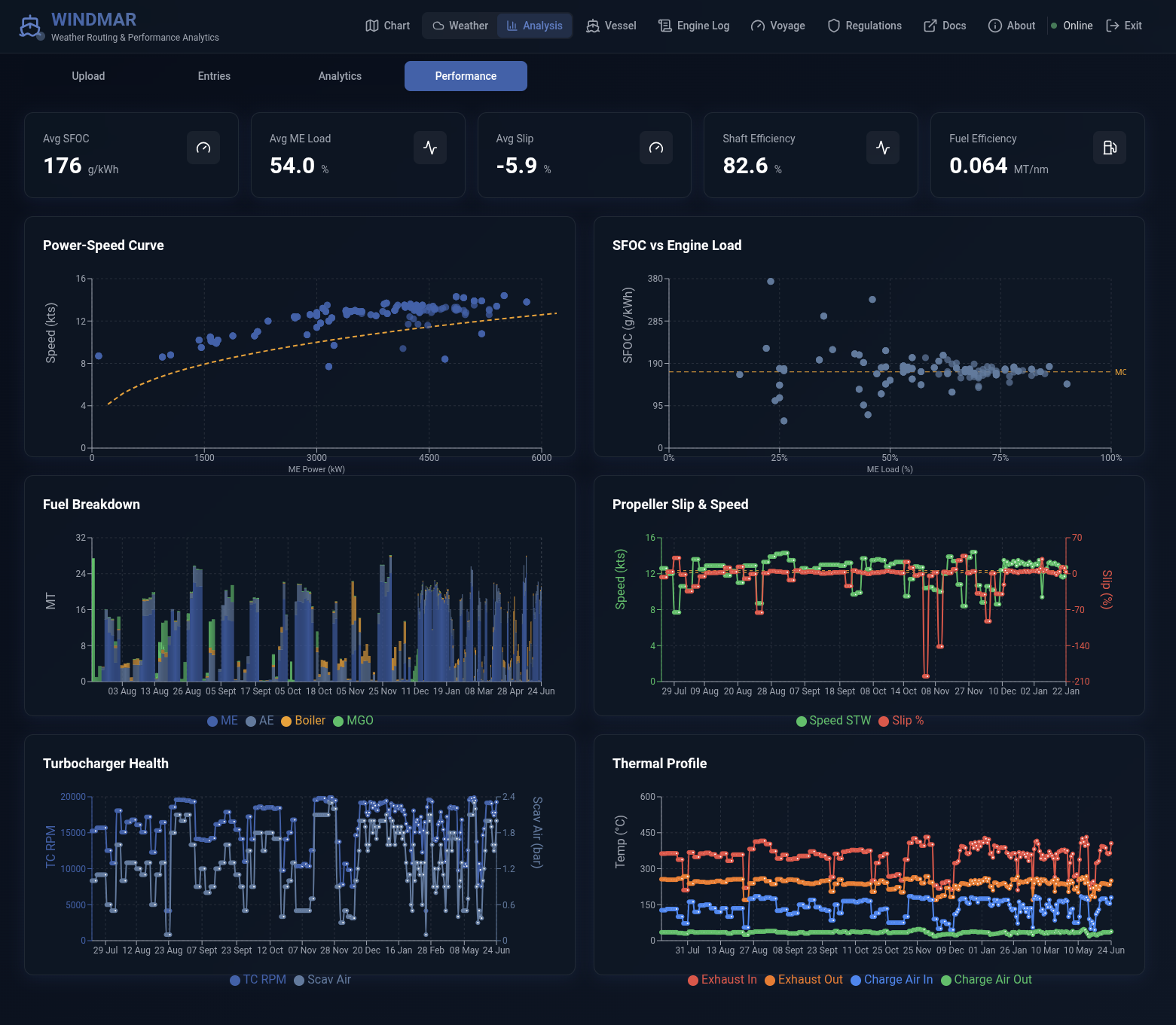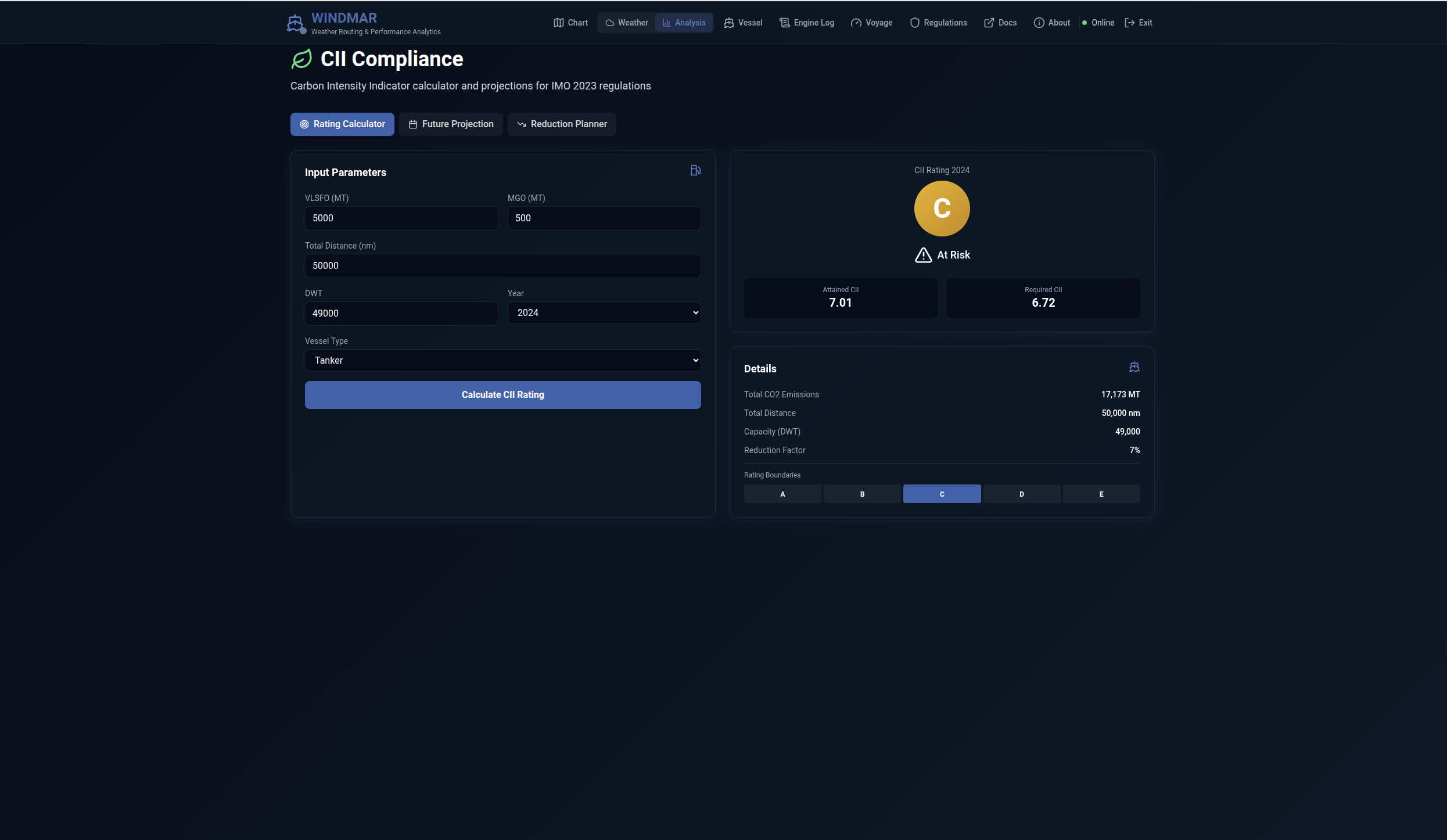 WindMar is a physics-based vessel performance modeling system with weather-aware A* route optimization, fuel consumption minimization, and IMO CII compliance tracking. It combines hydrodynamic resistance calculations, seakeeping analysis, and real-time weather data to find the safest and most fuel-efficient routes for merchant ships.