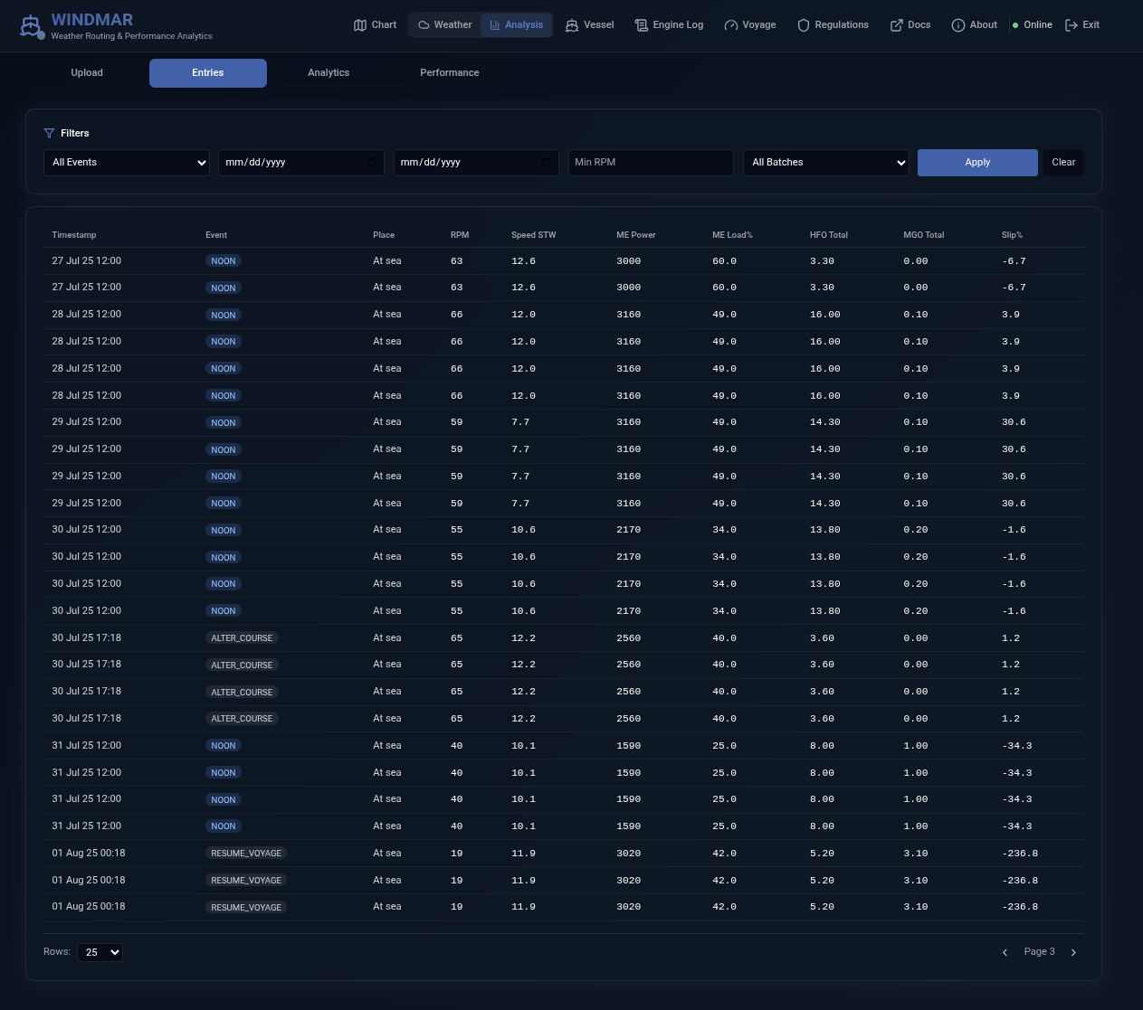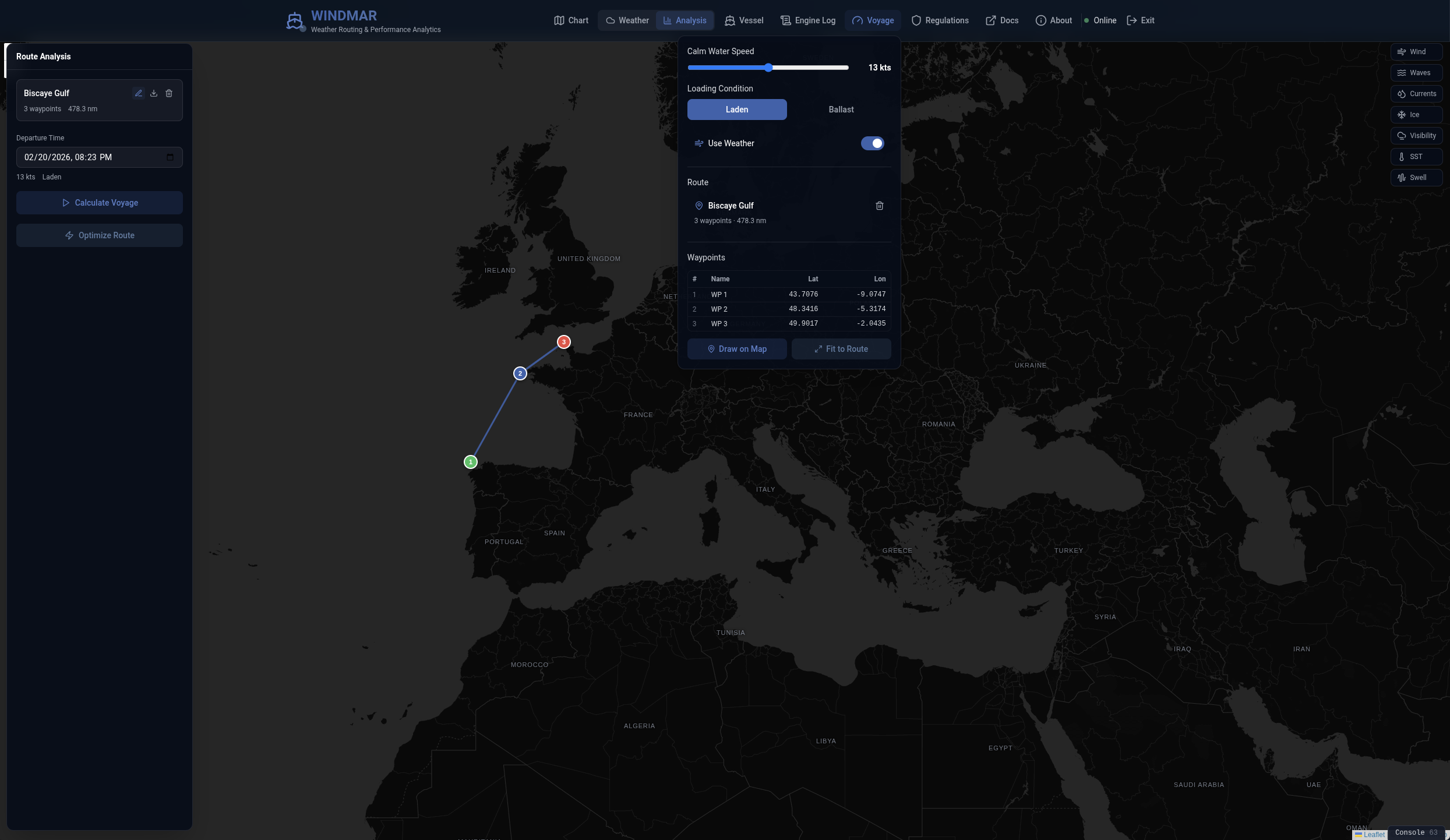 - Route Definition — User defines departure, arrival, and waypoints on the map interface. Vessel condition (laden/ballast) and speed preferences are selected.