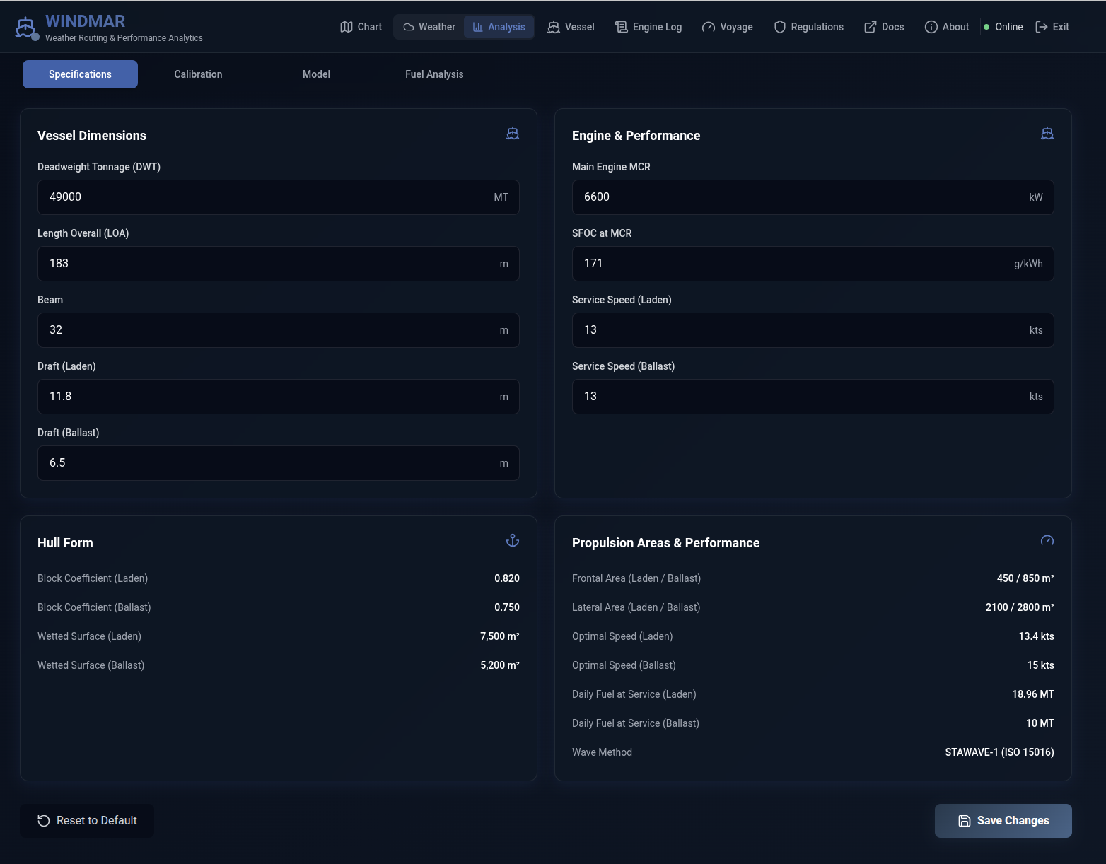 Calibration adjusts the physics model parameters to match observed vessel performance from noon report data. This accounts for hull fouling, propeller degradation, and other vessel-specific factors that cause the default model to deviate from actual fuel consumption.