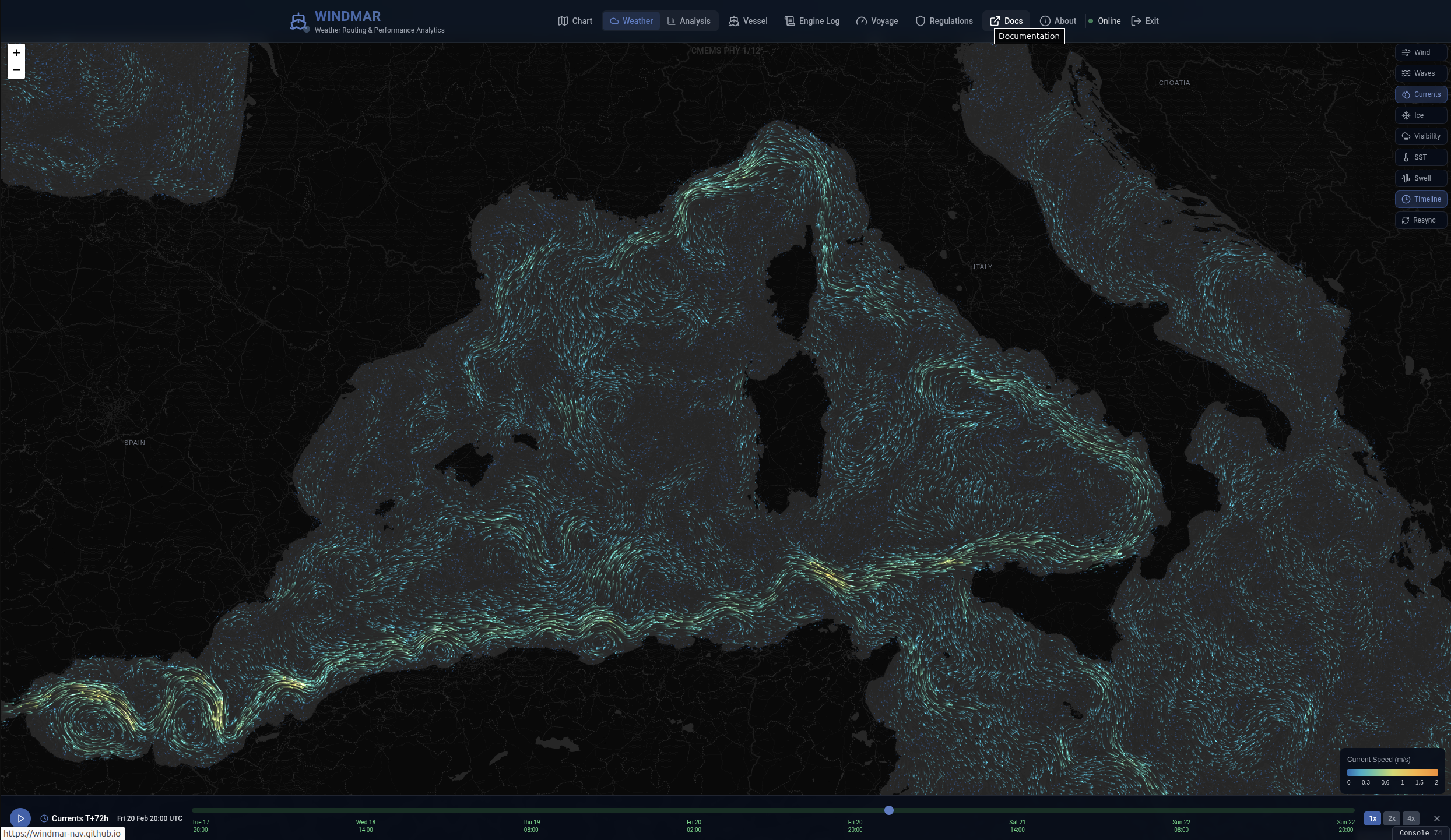 | v0.0.7 | 2026-02-13 | Two-mode architecture (Weather/Analysis), 7 weather layers with WMO color ramps, forecast timeline for all layers, analysis panel + detail page with per-waypoint passage plan, route save/load, current & wave direction in results, Monte Carlo P10/P50/P90, vessel speed sync |